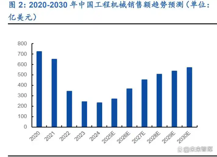 挖掘机、起重机、装载机占据主要市场空间,未来预计趋势向好。2020 年至 2023 年,受市场周期波动影响,挖掘机销售额有所下降。自 2024 年起,我国挖掘机市场 逐步回暖,销售额达到 84 亿美元,预计到 2030 年将达到 214 亿美元。起重机市场 受风电行业、港口物流等行业需求边际回暖影响,2024 年我国市场规模约为 33 亿 美元。装载机市场受港口及基础设施等行业需求增长的推动,市场规模从 2024 年的 31 亿美元预计增加至 2030 年的 42 亿美元,复合年增长率约为 5%,保持稳健增长 态势。据中国工程机械工业协会对挖掘机主要制造企业统计,2025 年 1—9 月,共 销售挖掘机 174039 台,同比增长 18.1%;其中国内销量 89877 台,同比增长 21.5%; 出口 84162 台,同比增长 14.6%。