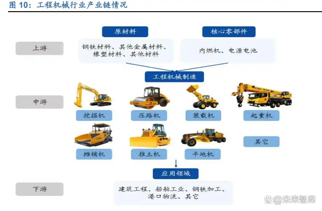 工程机械产业链主要包括上游原材料零部件供应商、中游工程机械制造商,下游则 覆盖多行业多领域。上游主要是为工程机械提供原材料及零部件制造行业,主要包括 如工程机械用钢铁材料、橡塑材料、内燃机等;中游包括挖掘机、起重机、压路机等不同类型的工程机械制造企业;下游覆盖多行业多领域,涵盖建筑工程、船舶工业、 钢铁加工、港口物流等领域。部分产品最终销售给工程建设公司,直接用于项目建设。