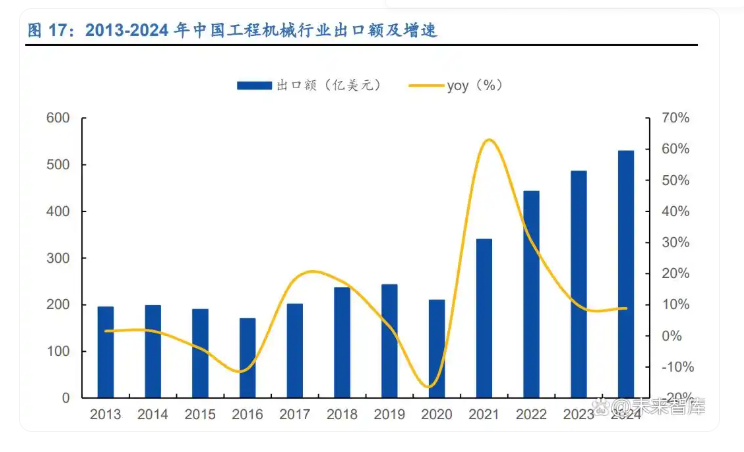 我国工程机械行业正通过多元化市场布局,积极开拓海外市场并取得显著成效。2024 年我国工程机械产品出口额首次突破 500 亿美元大关,已连续四年实现高位增长。 新兴市场逐步成为增长主力,亚洲、欧洲、非洲为主要出口地区,其中对非洲出口销 售额累计同比增长 32%,成为行业出口的强劲增长引擎。这主要得益于非洲地区及 “一带一路”共建国家的基础设施建设需求持续拉动以及矿业开采的不断推进。